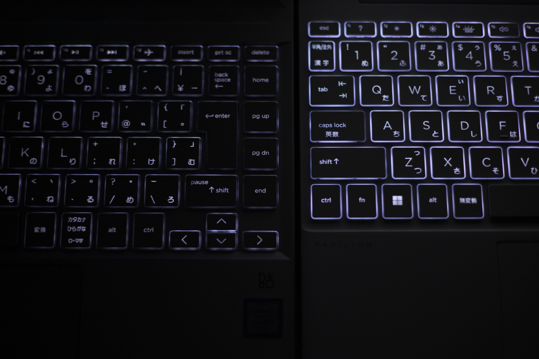 Pavilion13 13-an1000(左)とPavilion Aero 13-be(右)のキーボードバックライト明るさ比較。